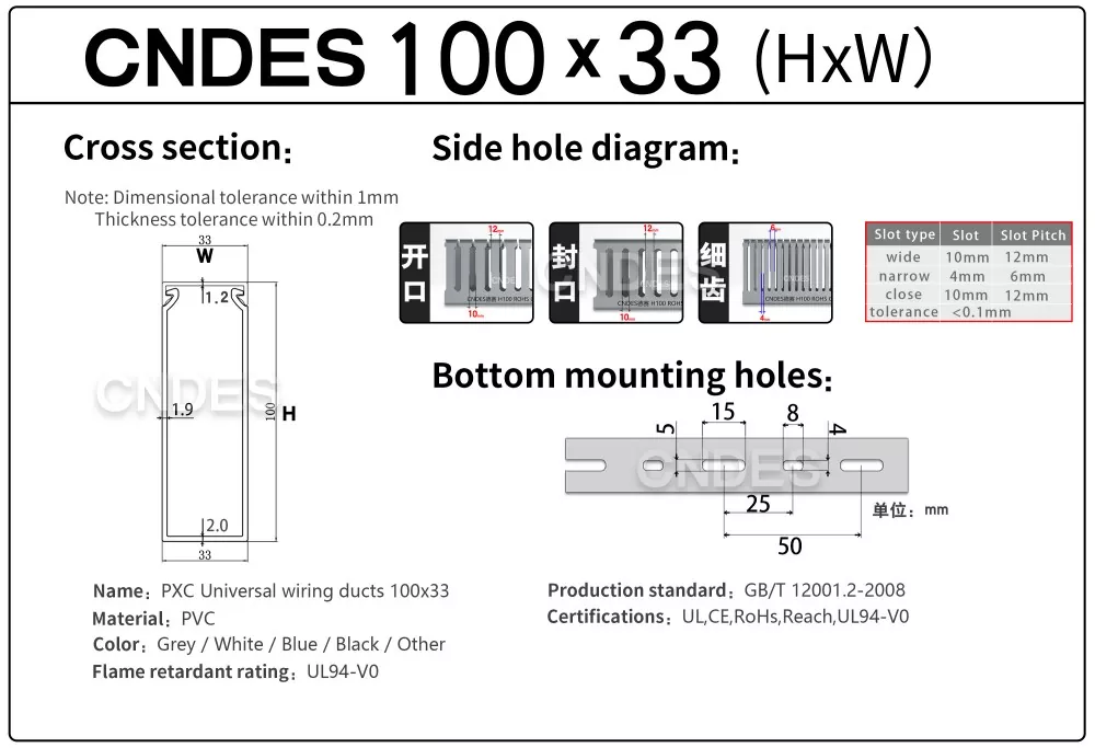 Mūsų kokybiškas 100 × 33 serverio stovo kabelių valdymas yra pagamintas iš UL94-V0 antipireno PVC medžiagos, atitinkančios tarptautinius standartus, tokius kaip RoHS, REACH, CE, UL ir ISO, užtikrinantys puikų atsparumą ugniai, ilgaamžiškumą ir ilgalaikę eksploatavimo saugą.