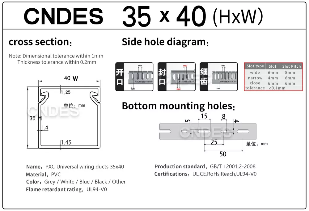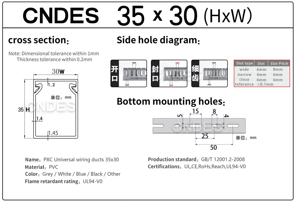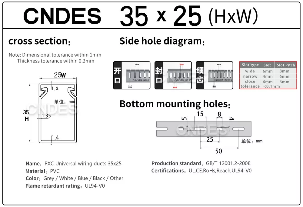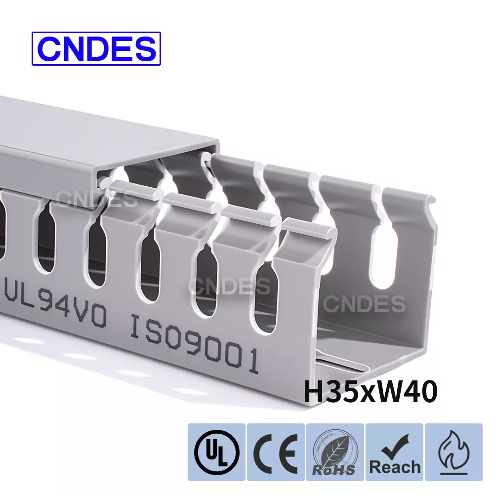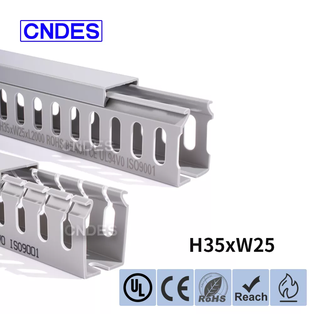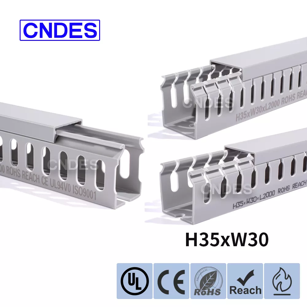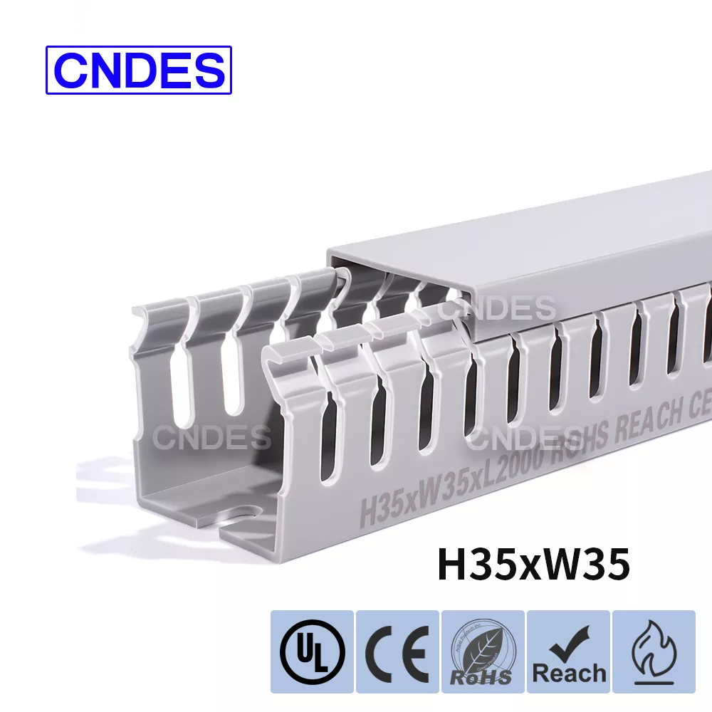 Individualus 35 mm aukščio plyšinis PVC vielos nukreipimo kanalas, pagamintas Kinijos įmonės CNDES, susideda iš standaus PVC pagrindo ir nuimamo dangčio. Pagrindas turi vienodu atstumu nutolusius į pirštus panašius griovelius, išspaustus iš abiejų pusių, formuojančius „šukos dantis“. Šiuos dantis galima sulaužyti rankomis, leidžiant vielai horizontaliai išeiti iš bet kurios padėties. Dangtis lengvai užsifiksuoja atgal į vietą, išlaikant tvarkingą išvaizdą. Montavimo angų eilė apačioje atitinka DIN 43659 standarto tarpus. Jį galima greitai pritvirtinti prie plokščių, spintelių rėmų ar panašių konstrukcijų naudojant M5 varžtus arba kniedėmis.