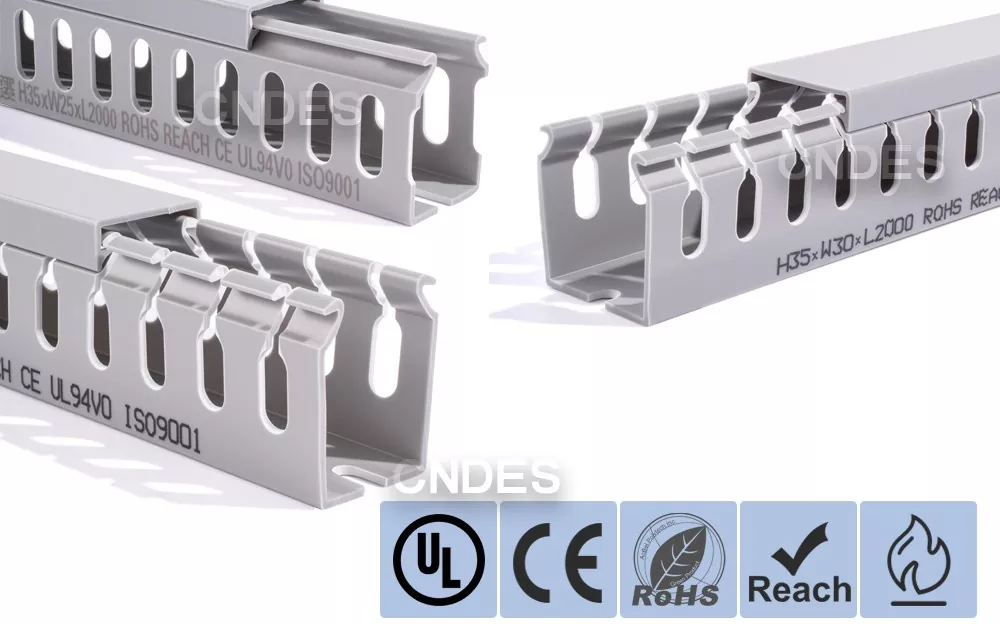 Tarptautiniai sertifikatai: mūsų pritaikytas 35 mm aukščio plyšinis PVC vielos išvedimo kanalas yra sertifikuotas pagal aukščiausius saugos standartus, įskaitant UL, CE, RoHS ir REACH.