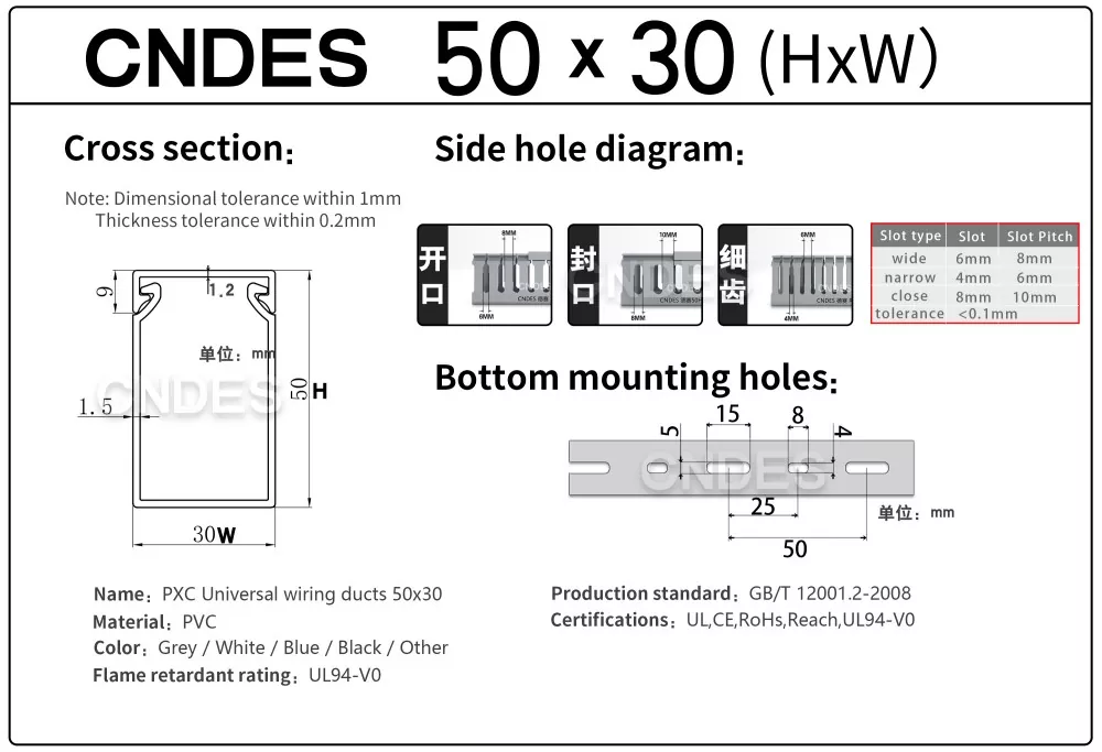 Kokybiškas 50 × 30 plyšių PVC kabelių organizavimo kanalas iš CNDES yra kompaktiškas ir efektyvus sprendimas, skirtas kabeliams tvarkyti ankštose vietose, pavyzdžiui, mažose valdymo spintose, duomenų gaubtuose ir įrangos jungiamosiose dėžutėse. Šis plono profilio laidų kanalas leidžia montuotojams organizuoti, atskirti ir apsaugoti laidus neužimant per daug vietos skydelyje.